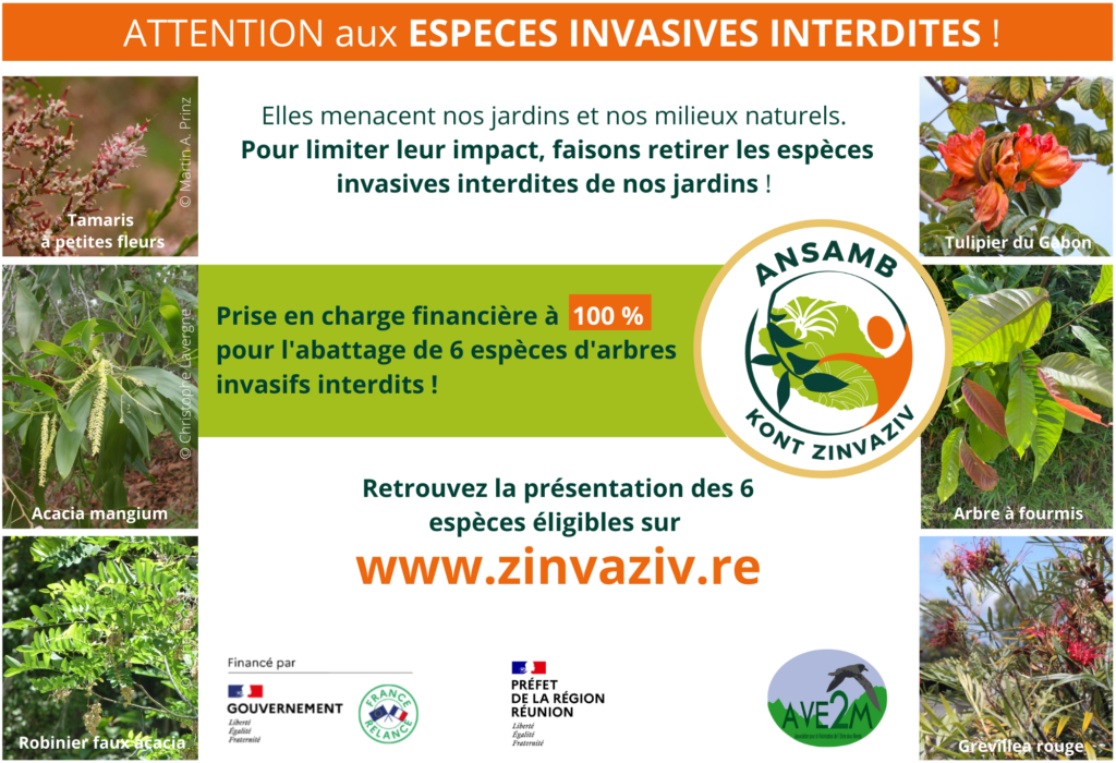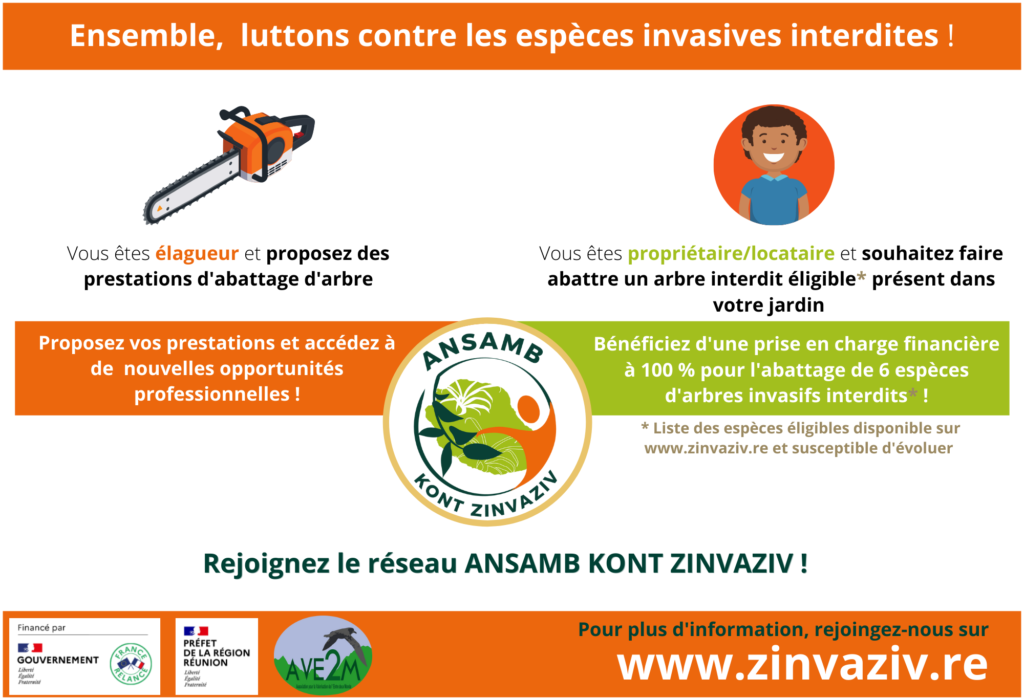 Afin d’encourager la lutte contre les espèces exotiques envahissantes chez les réunionnais, et de relancer l’activité des professionnels de l’élagage impactés par la crise sanitaire, l’AVE2M a mobilisé un financement dans le cadre du plan de relance gouvernemental pour mener le projet « Ansamb kont zinvaziv« . Le projet « Ansamb kont zinvaziv » propose une plateforme web permettant de mettre en lien des professionnels de l’élagage et des particuliers souhaitant faire abattre certains arbres interdits par l’arrêté ministériel de 2019 présents dans leur jardin.