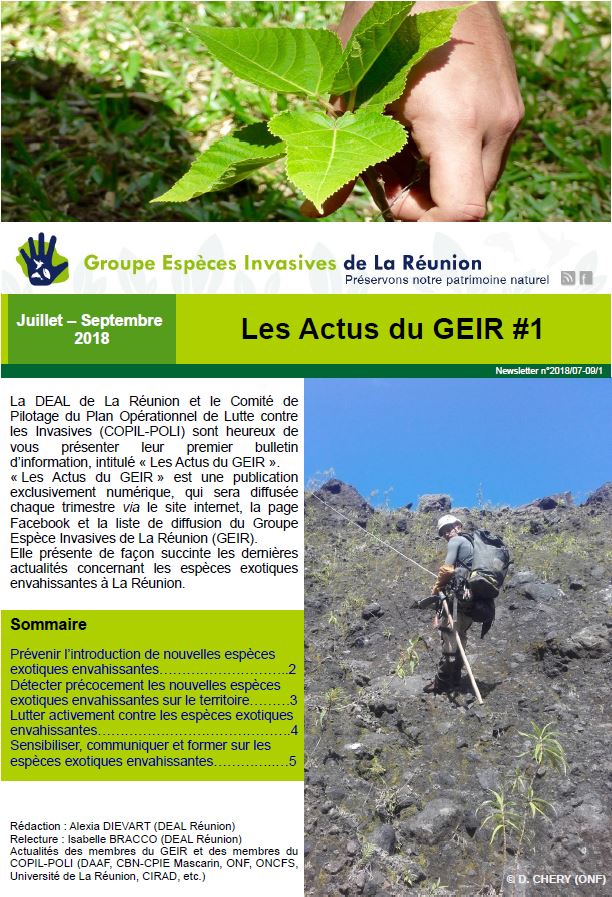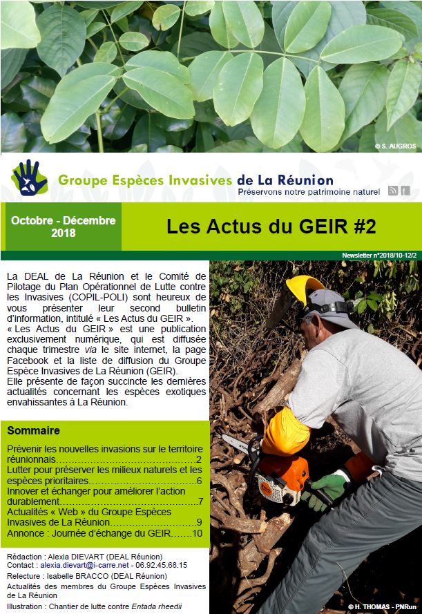 Dans les actus de janvier à mars 2019 : une présentation du POLI 3 (2019-2022), un retour sur l’action de lutte précoce sur le corbeau (Corvus splendens) au Port, un retour sur la journée d’échange du Groupe Espèces Invasives de La Réunion, un point sur le Centre de Ressources sur les Espèces Exotiques Envahissantes et […]