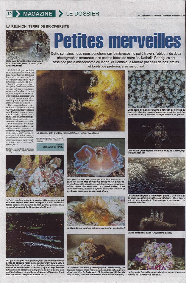 Cette semaine, nous nous penchons sur le microcosme péi à travers l’objectif de deux photographes amoureux des petites bêtes de notre île. Nathalie Rodrigues est fascinée par le microcosme du lagon, et Dominique Martiré par celui de nos jardins.