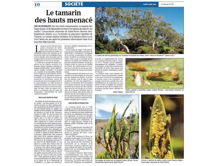 Roi des forêts réunionnaises, le tamarin des hauts risque-t-il de disparaître victime d’un minuscule insecte, un psylle ? L’association citoyenne de Saint-Pierre observe avec inquiétude, depuis 2010, la montée en puissance régulière de l’insecte. Le Groupe espèces invasives de la Réunion lance à son tour l’alerte six ans après les premières observations mais il est […]