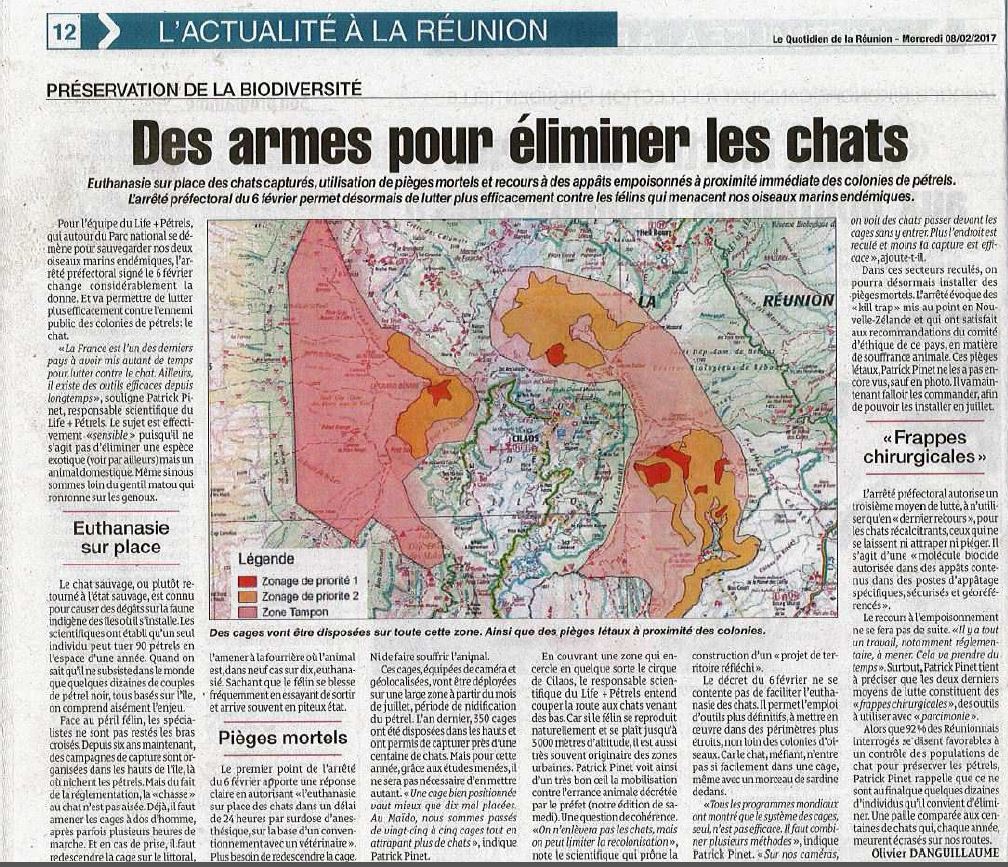 Euthanasie sur place des chats capturés, utilisation de pièges mortels et recours à des appâts empoisonnés à proximité immédiate des colonies de pétrels. L’arrêté préfectoral du 6 février permet désormais de lutter plus efficacement contre les félins qui menacent nos oiseaux marins endémiques.