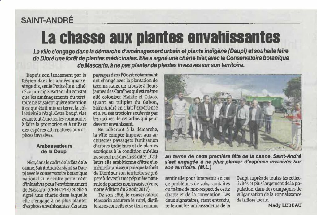 La ville (Saint André) s’engage dans la démarche d’aménagement urbain et plante indigène (Daupi) et souhaite faire de Dioré une forêt de plantes médicinales. Elle a signé une charte hier, avec le Conservatoire botanique de Mascarin, à ne pas planter de plantes invasives sur son territoire.