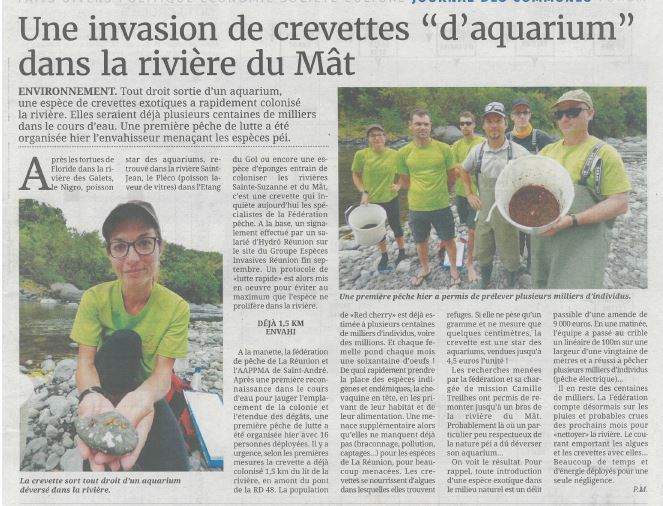 Tout droit sortie d’un aquarium, une espèce de crevettes exotiques a rapidement colonisé la rivière. Elles seraient déjà plusieurs centaines de milliers dans le cours d’eau. Une première pêche de lutte a été organisée hier (le 8 novembre 2017), l’envahisseur menaçant les espèces péi.