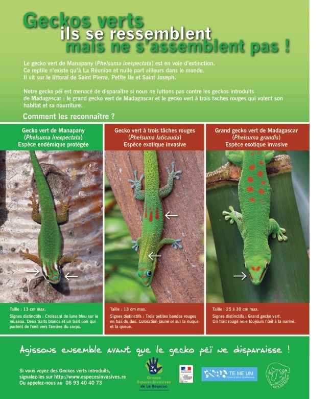 Le grand gecko vert de Madagascar, Phelsuma grandis, a été introduit dans les milieux naturels de La Réunion au milieu des années 1990. Considérée comme une espèce invasive, depuis 2012 son introduction sur l’île est interdite (A.P. n°12-920) et sa destruction administrative est autorisée (A.P. n°12-921).