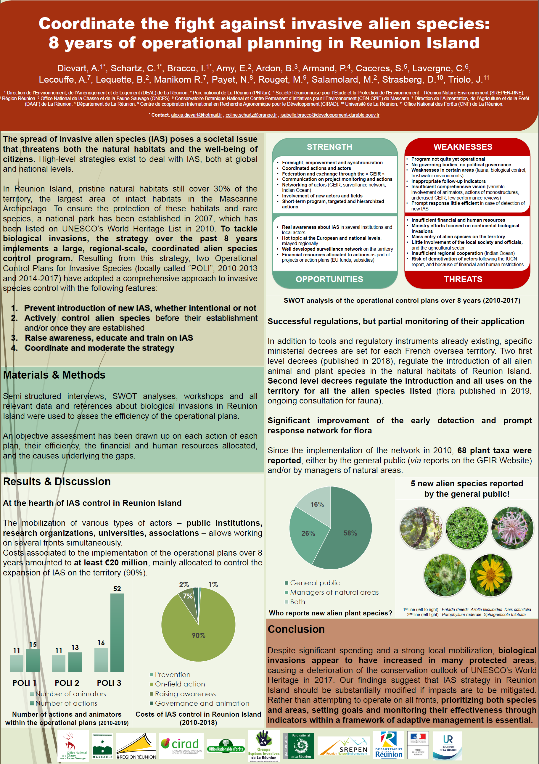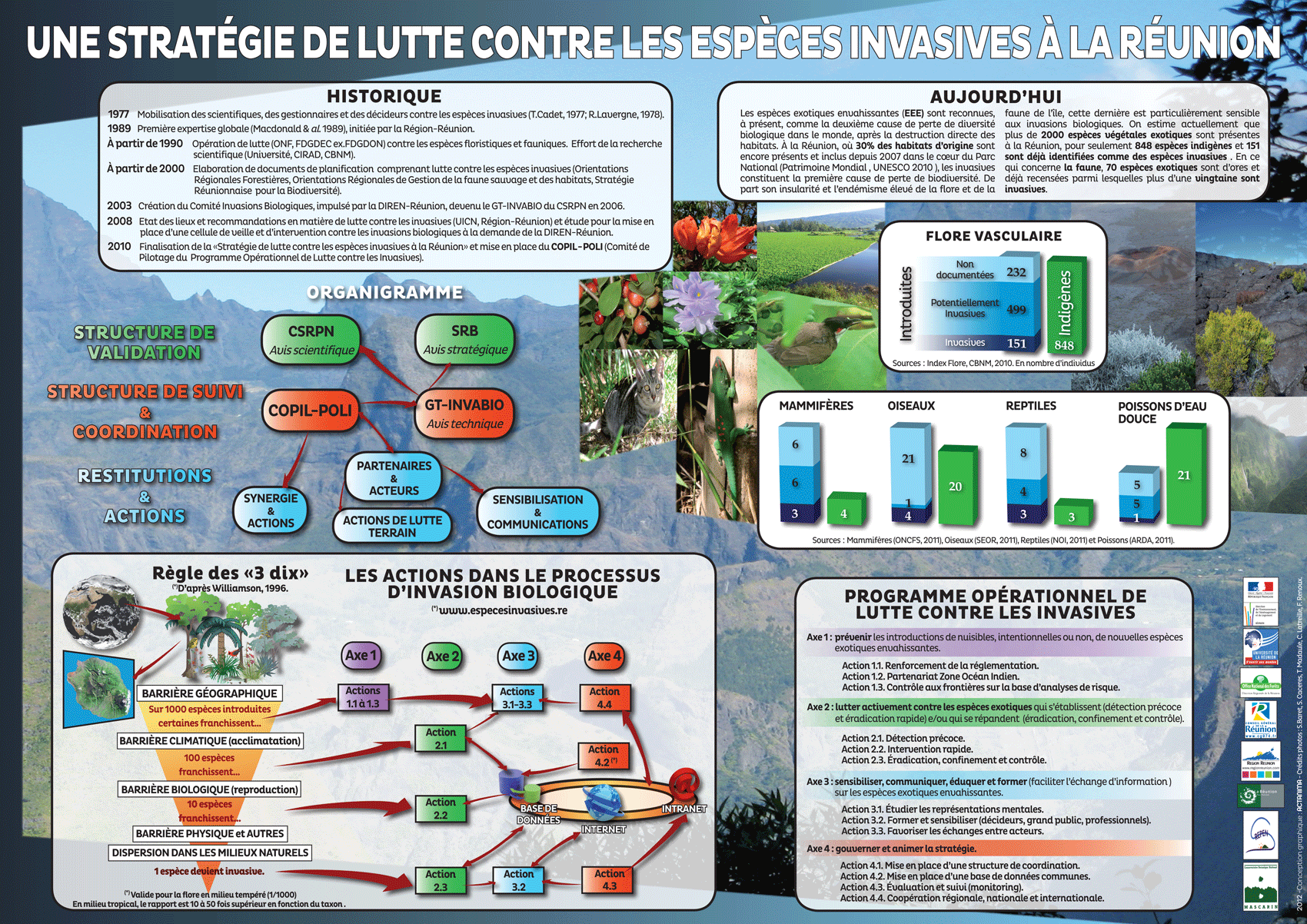 Dès novembre 2008, une démarche collégiale pilotée par la Direction Régionale de l’Environnement (DIREN), le Parc National de La Réunion et le Conseil Régional, a été lancée visant à l’élaboration d’une stratégie régionale de lutte contre les invasives regroupant tous les partenaires locaux (ex. administrations et établissements publics, collectivités, associations naturalistes, groupements socio-professionnels). Le 6 mai 2010, cette stratégie a été validée par le Conseil Scientifique Régional du Patrimoine Naturel (CSRPN), avant d’être présentée au comité de suivi de la Stratégie Réunionnaise pour la Biodiversité (SRB).